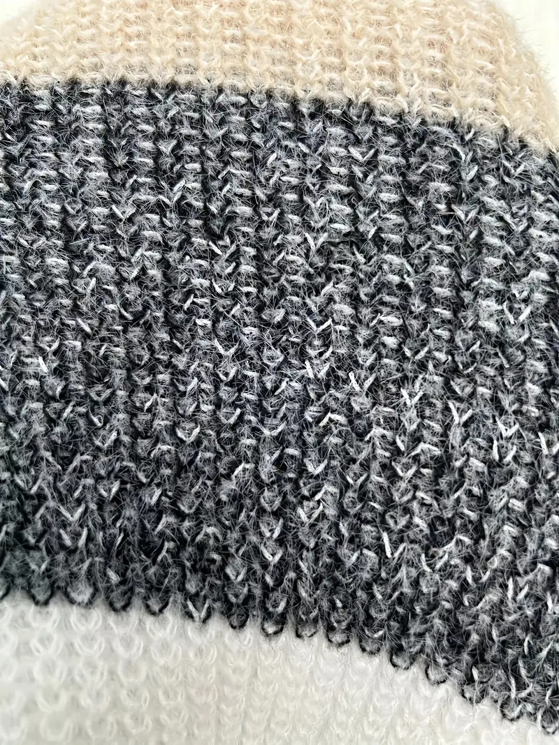 Color Block Fuzzy Knitted Dress, Elegant Drop Shoulder Lantern Sleeve Crew Neck Mini Dress For Fall & Winter, Women's Clothing