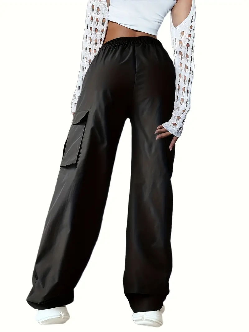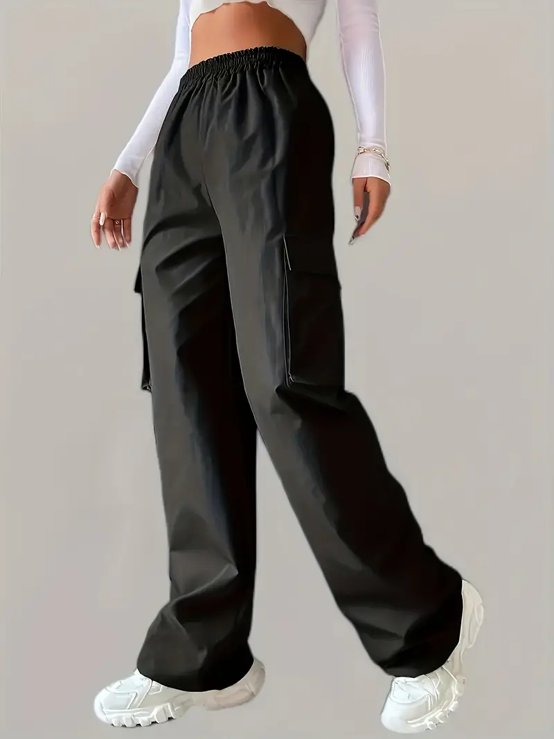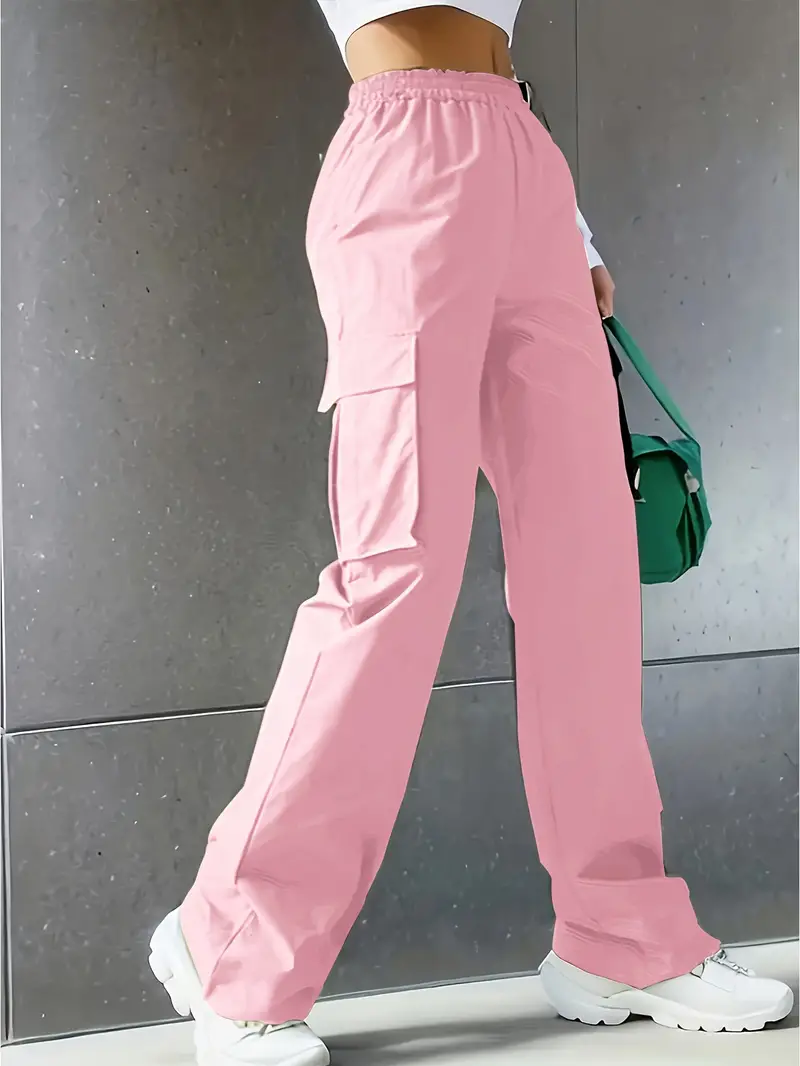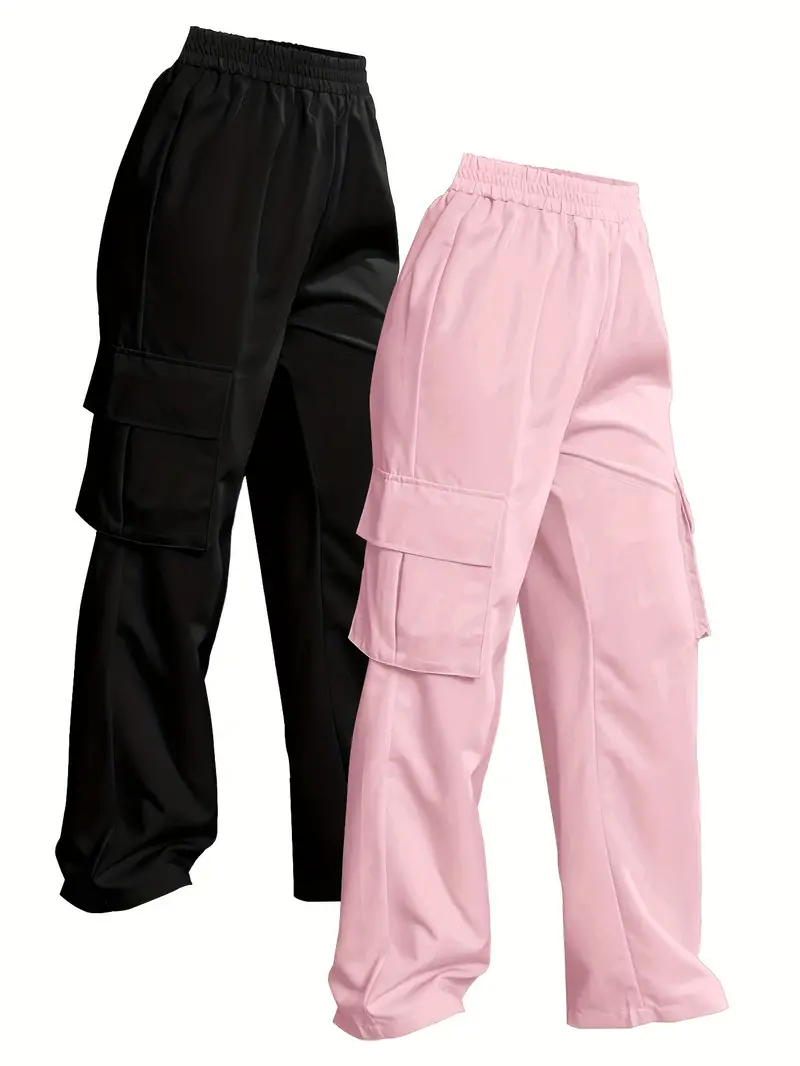 Solid Color Cargo Pants 2 Packs, Casual Elastic Waist Wide Leg Flap Pockets Pants, Women's Clothing
